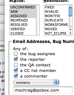 > Is there a tag or a search you use to find relevant WOLips-related bugs in bugs.eclispe.org? I can do a search for "WOLips" and I see 9 bugs (below), and then there are the 260 open bugs aginst 'Mac OS X - Cocoa'. But I suspect there are some bugs that do not have "WOLips" in the strings but which are (in our opinion) blocking us. Do we have a way to track those bugs?